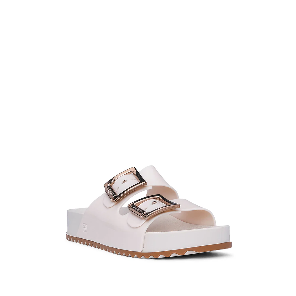 Design cuidado encontra conforto: a pele sintética bege oferece um toque suave, enquanto a palmilha acolchoada se adapta aos contornos dos pés, proporcionando sensação de suavidade durante o uso. A base com sola antiderrapante assegura estabilidade em diferentes superfícies, mantendo um acabamento limpo e premium. As fivelas metálicas em tom metalizado acrescentam um brilho discreto, elevando o conjunto sem sacrificar a sobriedade.