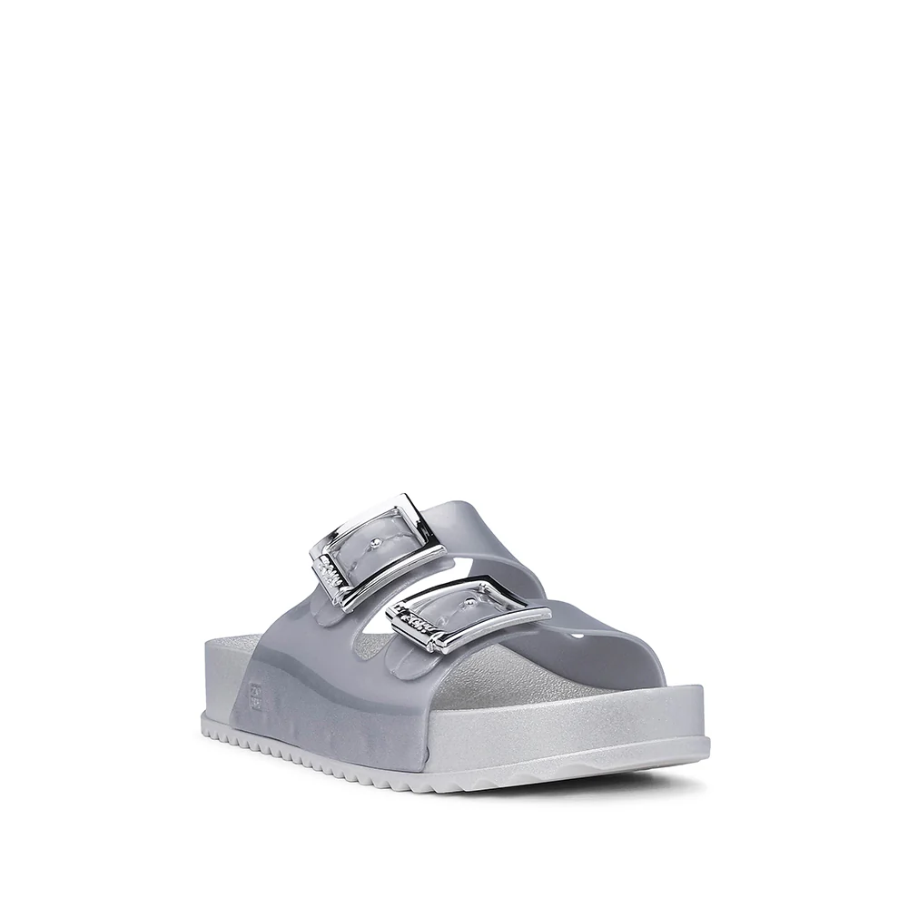 Design moderno e funcional, com tiras em pele sintética e fivelas ajustáveis que garantem um ajuste seguro. A base macia oferece conforto superior, enquanto a construção reforça a qualidade — um calçado que combina leveza, durabilidade e um acabamento prateado que não passa despercebido.